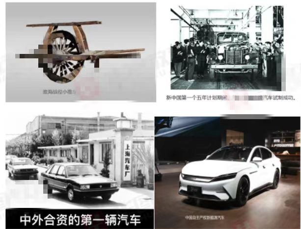 第四題(四個圖):1、淮海戰役的小推車;2、中國第一輛解放牌汽車;3、首輛中外合資的汽車;4、我國自主研發設計的新能源汽車。看到這四幅圖片你想到了什么?